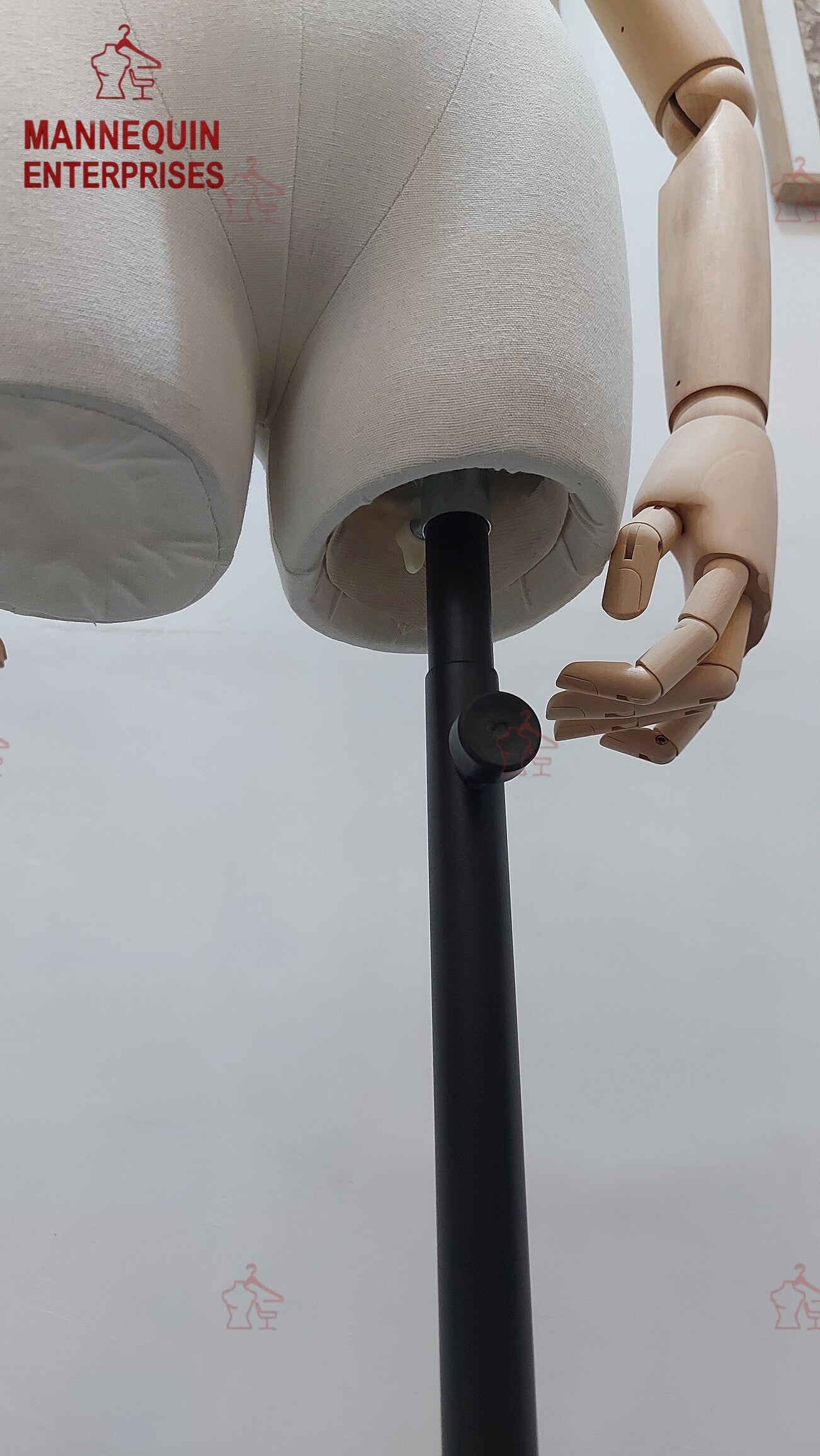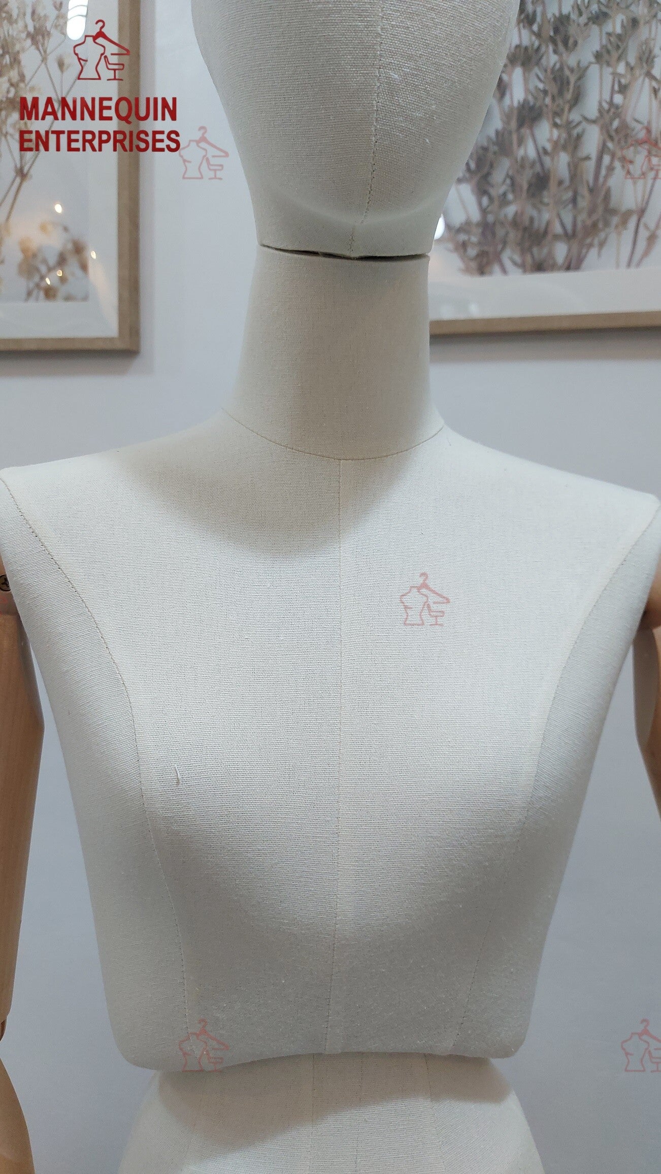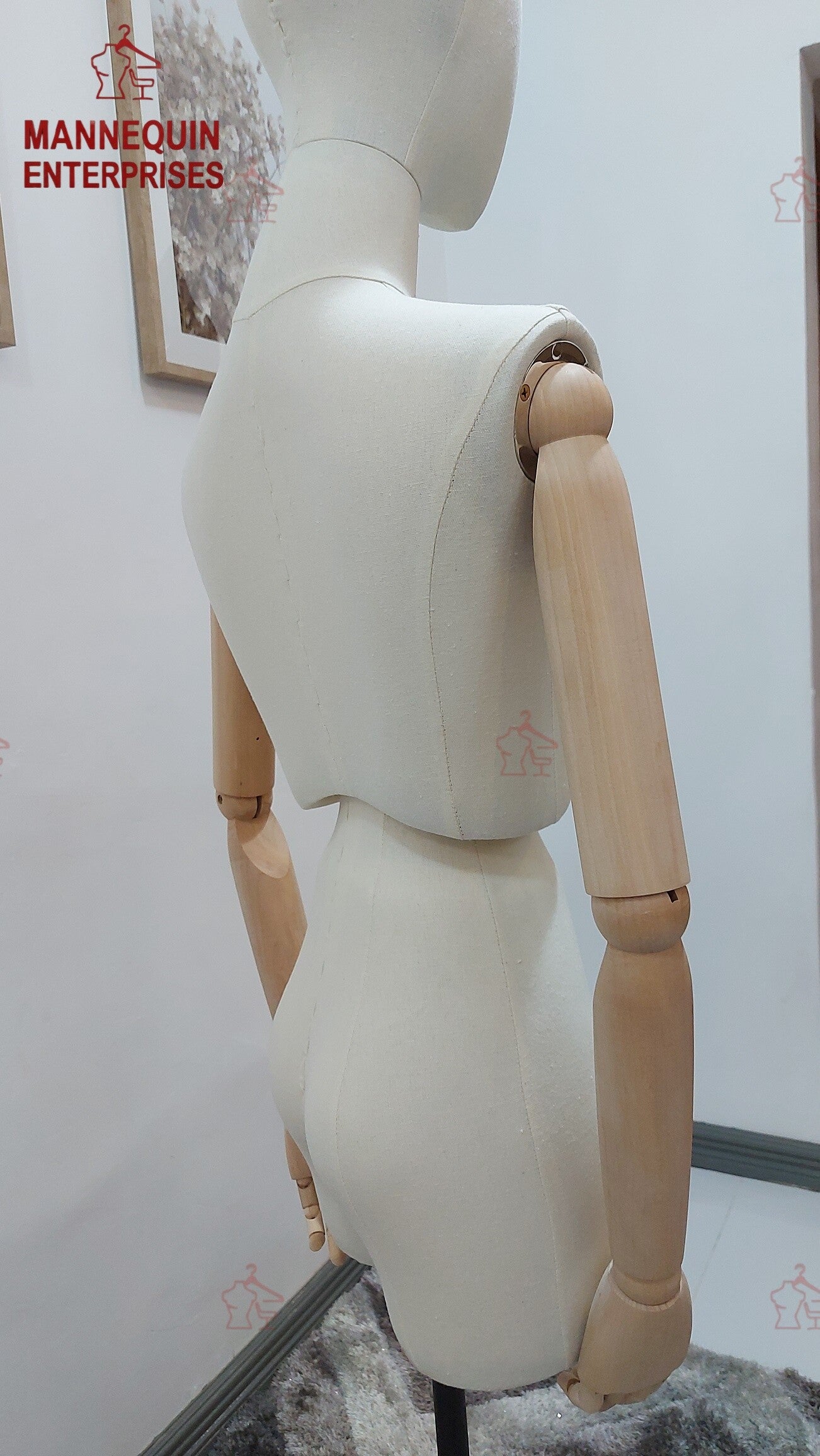 This boutique-quality female half-body dress form is designed for elegant window and showroom displays. Crafted from premium fiberglass and wrapped in a soft beige fabric, it provides a refined, high-end look suitable for fashion boutiques, designer stores, studios, and tailoring spaces. The articulated wooden arms add versatility and styling flexibility, while the strong iron base ensures stability and height adjustability.