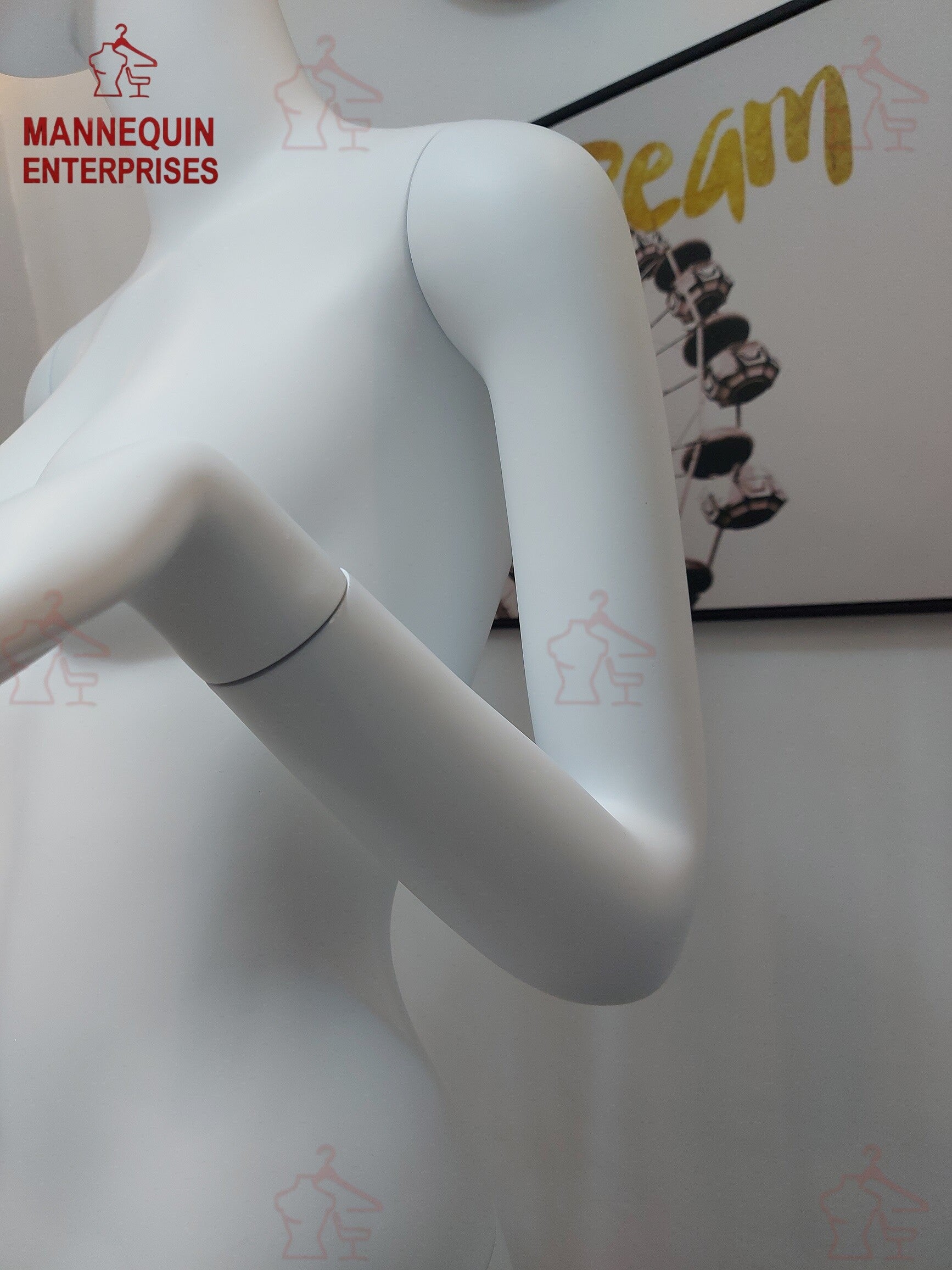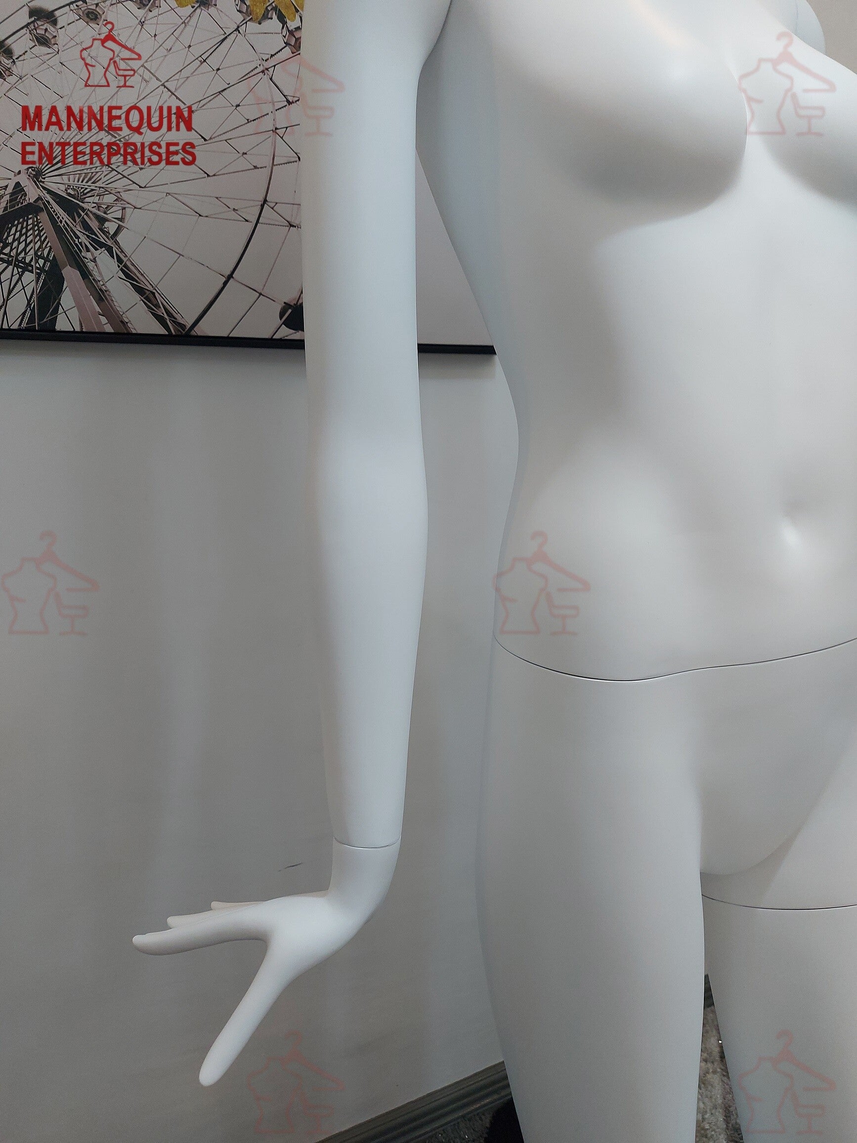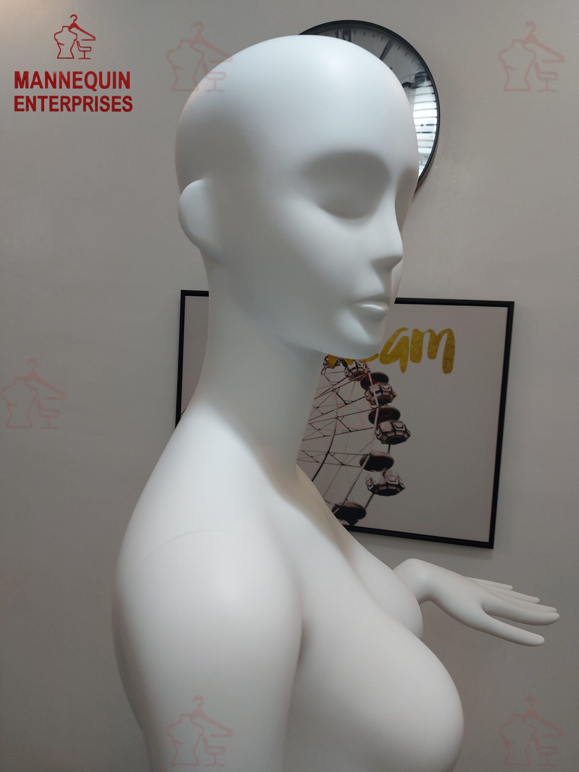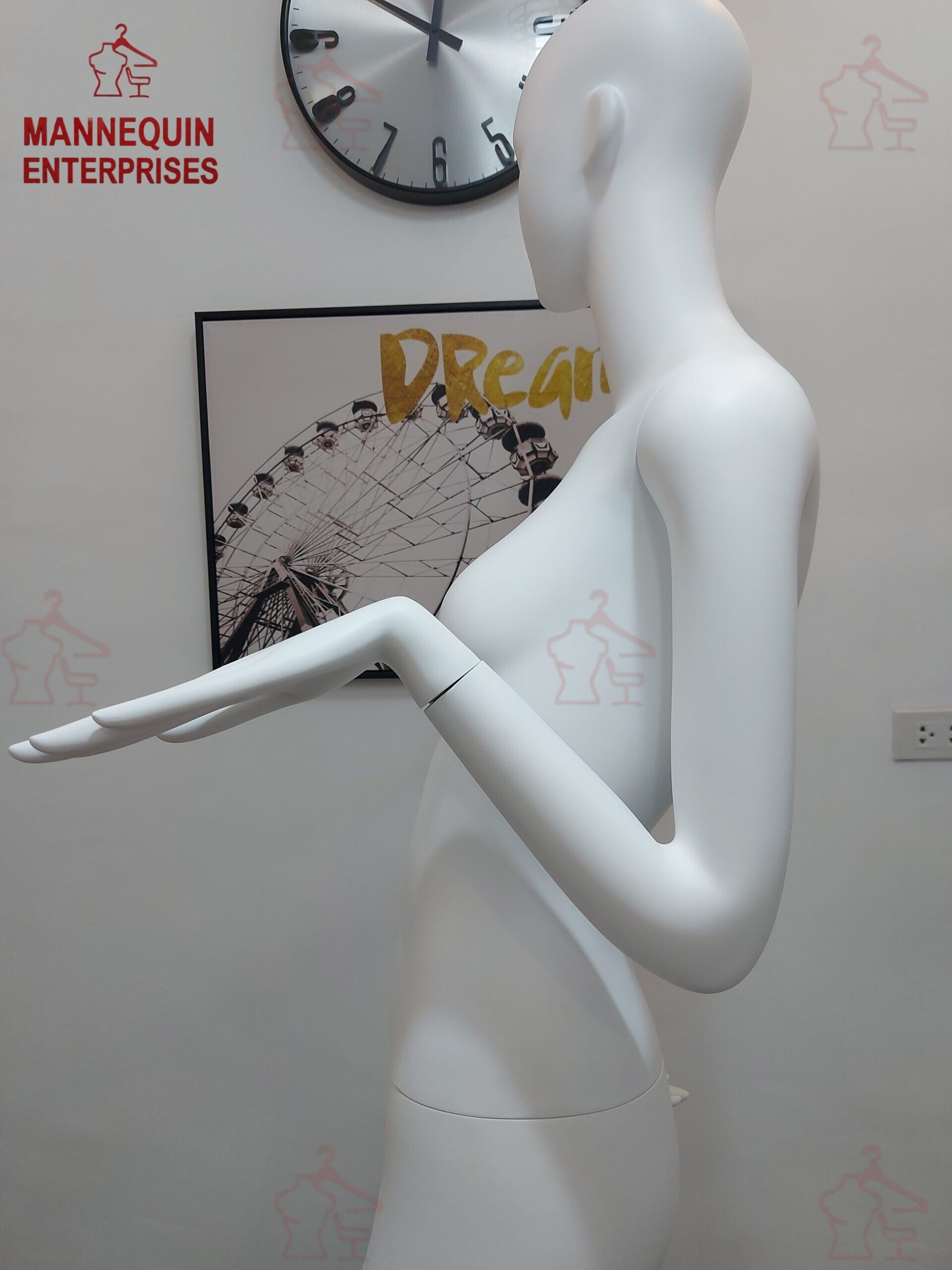 A premium-quality female full-body mannequin crafted from top-grade fiberglass and styled with a modern abstract egghead design. Its matte-white finish provides a clean, contemporary look that enhances any outfit, making it ideal for high-end boutiques, designer showrooms, and professional window displays. Built with strong balance and high durability, this mannequin ensures clothing drapes smoothly for a polished presentation.