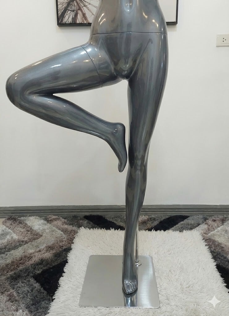 This extra-tall premium full-body female mannequin features a modern matte grey finish designed for high-impact visual displays. Standing at an impressive 215 cm, it creates a dramatic and commanding presence ideal for window displays, luxury boutiques, and statement merchandising setups. Made from high-quality PP plastic, this mannequin offers durability, stability, and a smooth matte surface perfect for both brightly lit displays and photography. It includes a glass base (stand style) that enhances its sleek, contemporary profile.