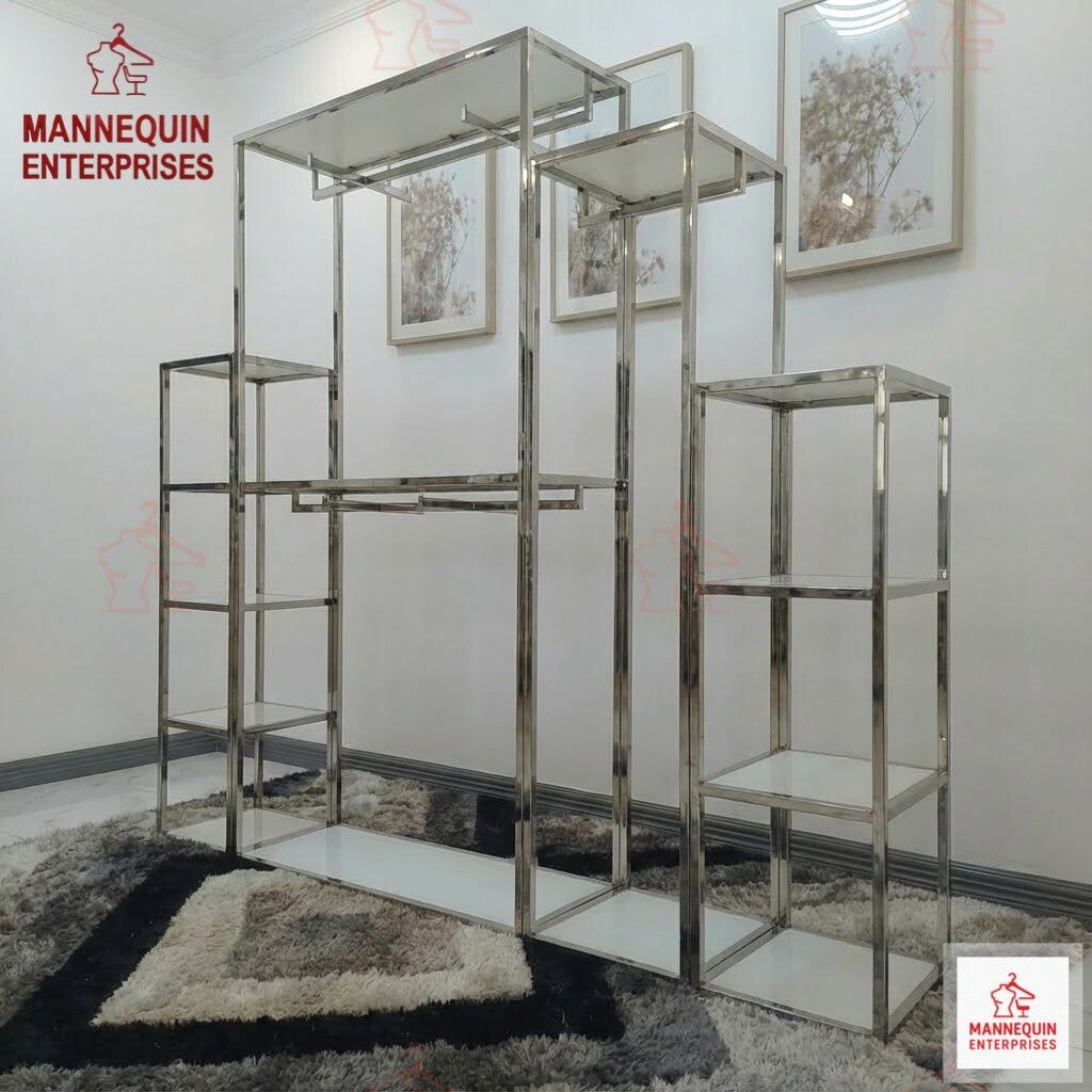 This Tall Silver Clothing & Display Rack features a modern open-frame structure with multiple MDF shelves, offering generous hanging and display space. Finished in sleek silver metal, it is designed for upscale boutiques, showrooms, and retail environments that require a clean, professional look.