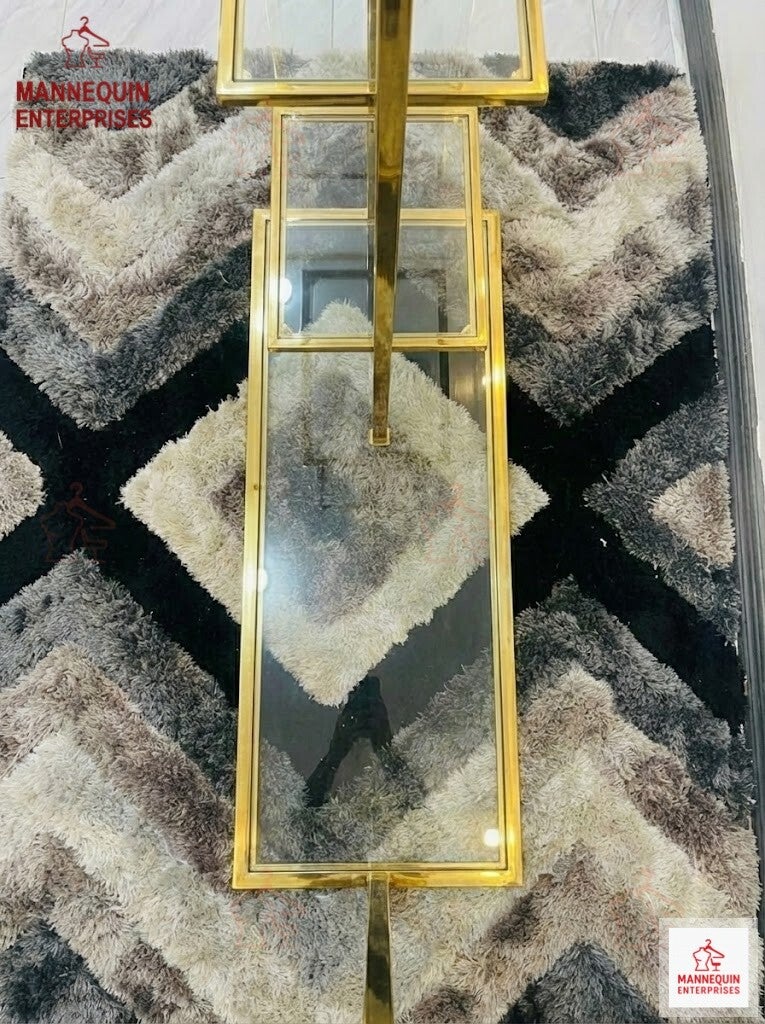 This Gold Clothing & Display Rack features a modern slanted hanging bar with integrated glass shelves for added display functionality. Its compact height and elegant gold finish make it ideal for boutiques, pop-up stores, and stylish retail interiors requiring both hanging and accessory display.
