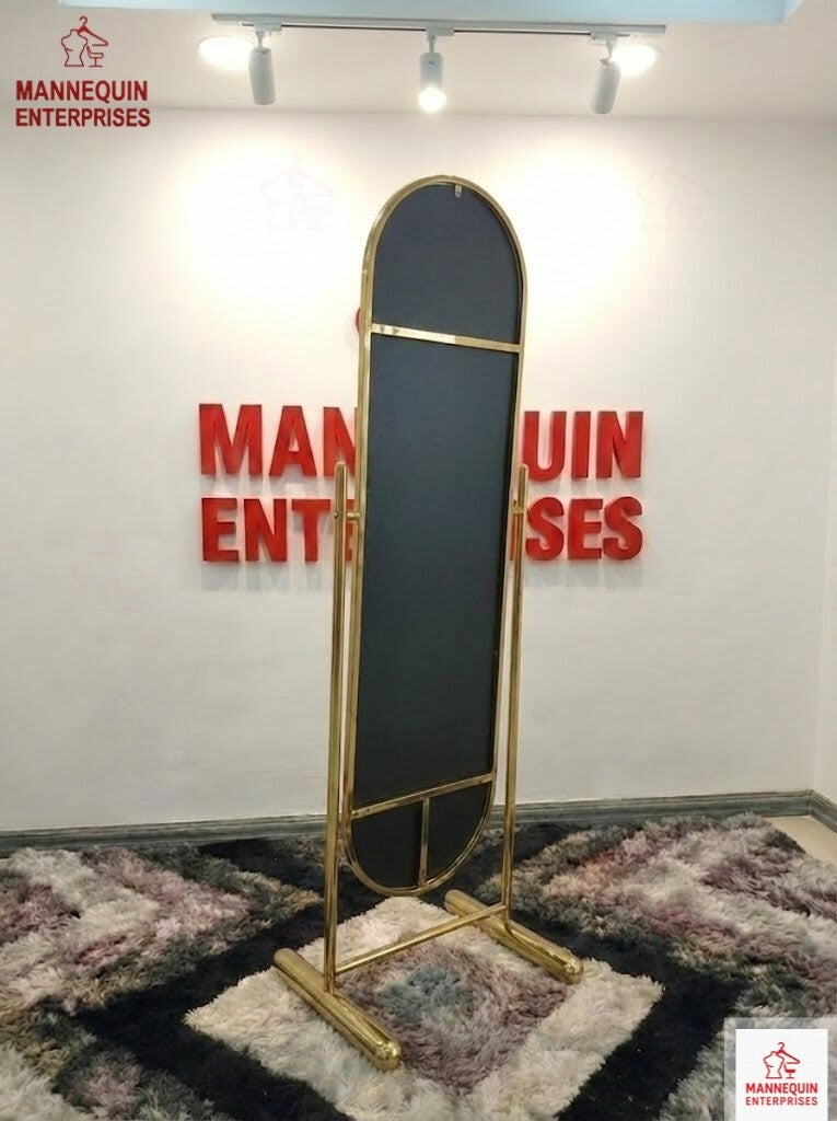 This gold free-standing mirror features a sleek arched design that adds elegance and functionality to boutiques, fitting rooms, bedrooms, and showrooms. Crafted with a sturdy metal frame and clear full-length mirror, it provides a stable and stylish solution for outfit viewing and space enhancement.