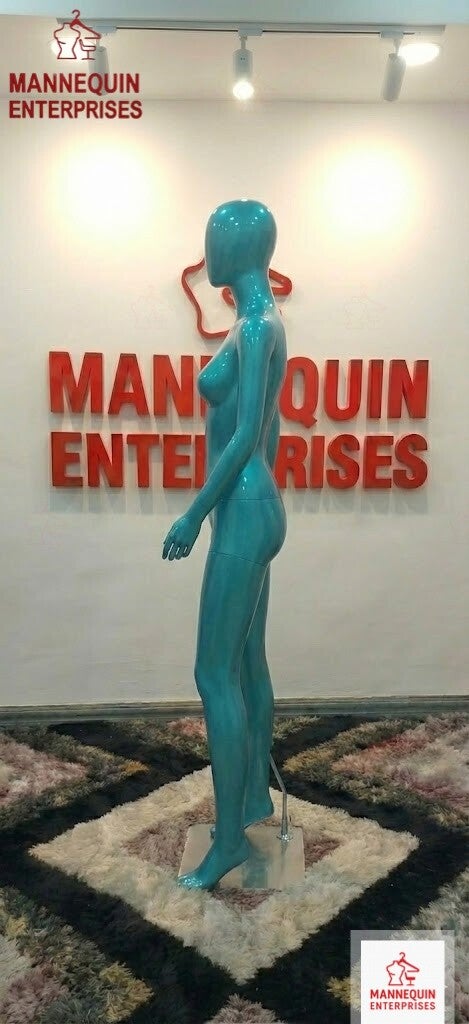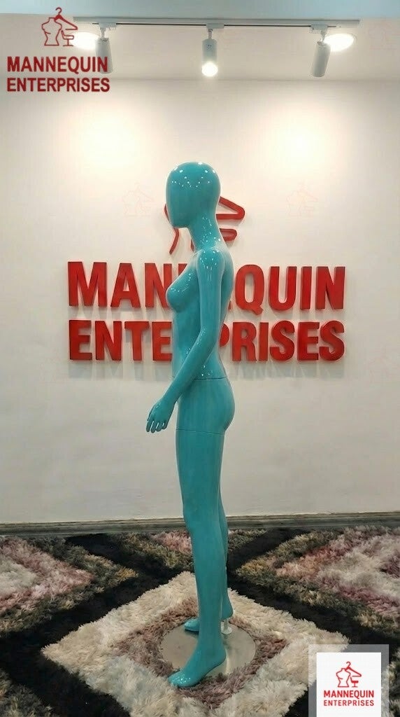 This glossy blue female mannequin is designed for professional retail and boutique displays. Made from high-quality fiberglass, it features a smooth mirror-like glossy finish that adds a bold, modern, and eye-catching look to any store display. Ideal for boutiques, fashion showrooms, and window displays.