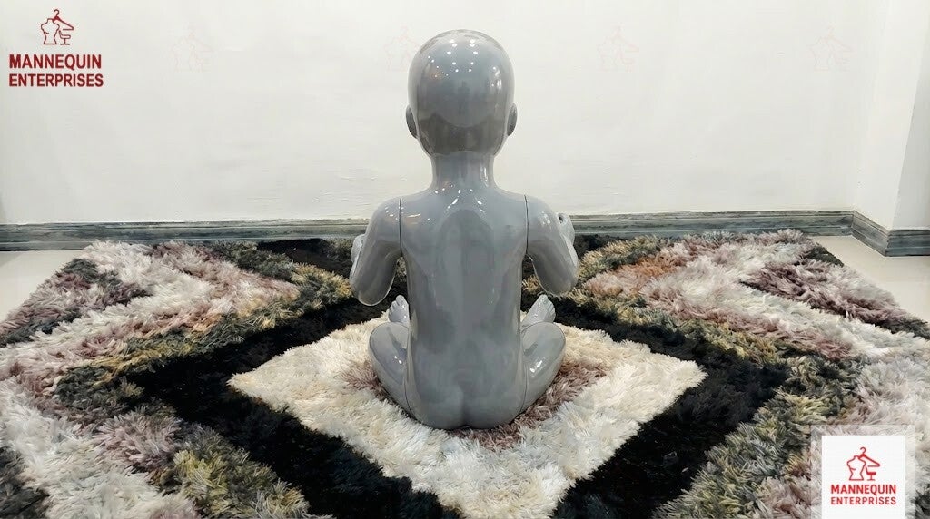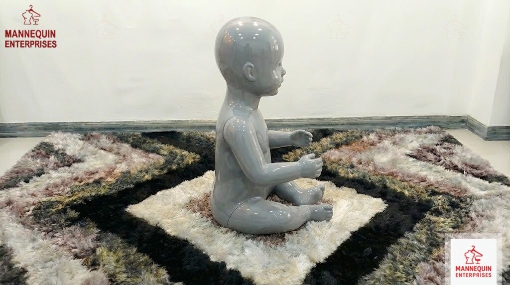 Perfect for infant clothing displays, this 6-month baby sitting mannequin is crafted from high-boutique-grade fiberglass and finished in soft matte white. Its realistic infant proportions make it ideal for showcasing baby apparel, accessories, and nursery products in any retail environment or window display. The sitting pose adds a natural, adorable look that instantly enhances visual merchandising.