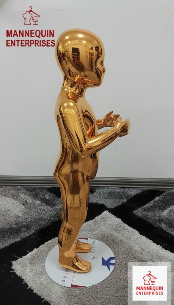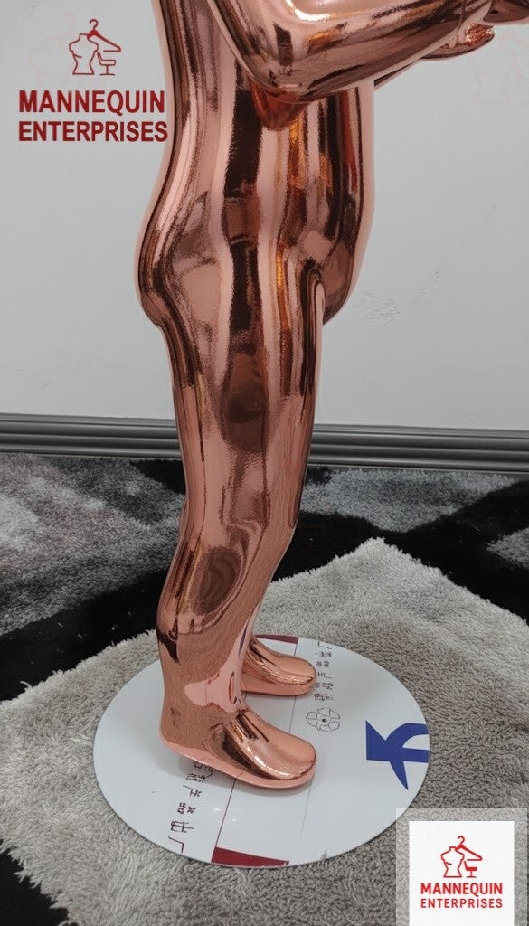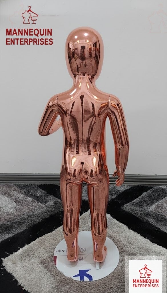 This glossy rose gold kid mannequin is designed for 1–3 years old children clothing displays, offering a modern, eye-catching look for boutiques and retail window displays. Crafted from high-quality fiberglass with a mirror-like chrome rose gold finish, it combines durability, stability, and premium visual appeal. Ideal for luxury kidswear, photoshoots, and high-end retail environments.