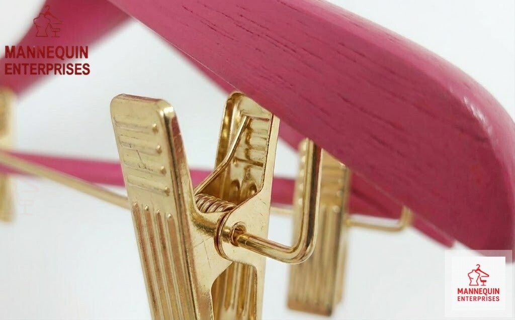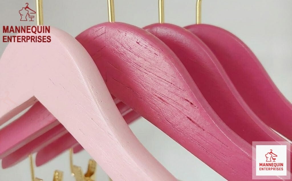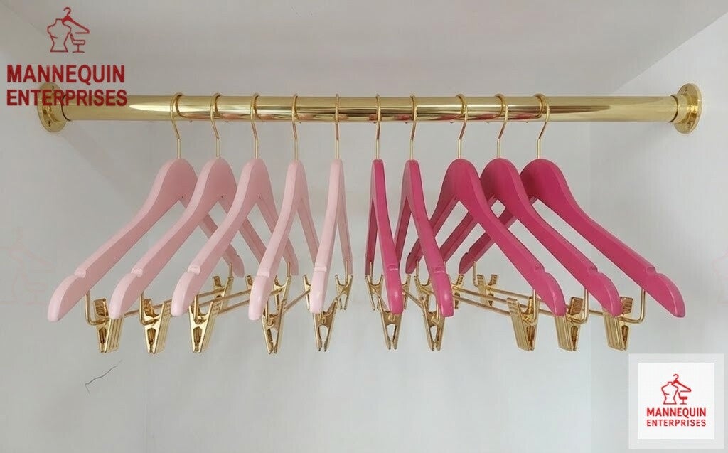 A premium wooden clothes hanger designed for boutiques, wardrobes, and retail displays. Finished in an elegant pink coating with gold metal hook and clips, this hanger provides strong support for garments while maintaining a luxury, polished appearance. Ideal for displaying clothing neatly and professionally.