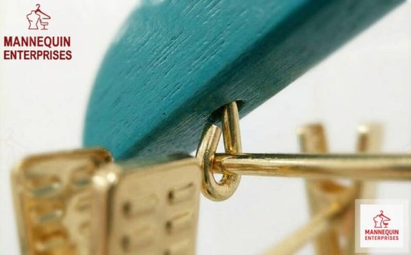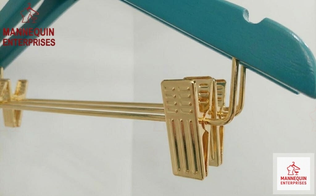 A premium wooden clothes hanger designed for boutiques, wardrobes, and retail displays. Finished in an elegant pink coating with gold metal hook and clips, this hanger provides strong support for garments while maintaining a luxury, polished appearance. Ideal for displaying clothing neatly and professionally.
