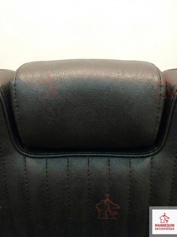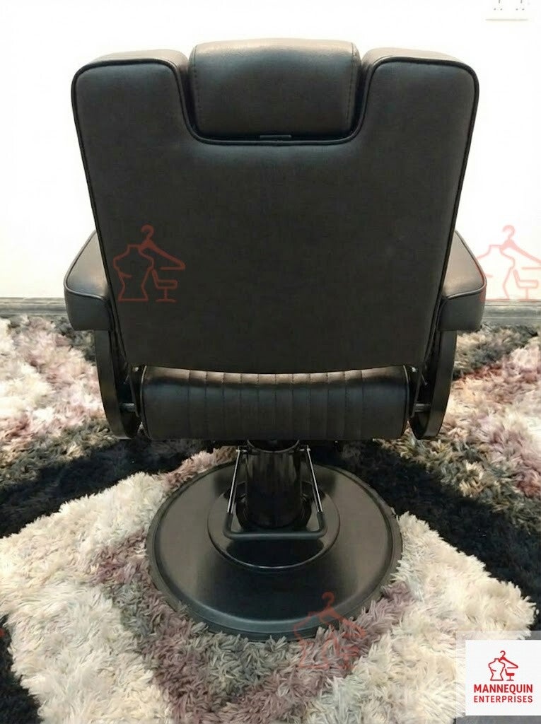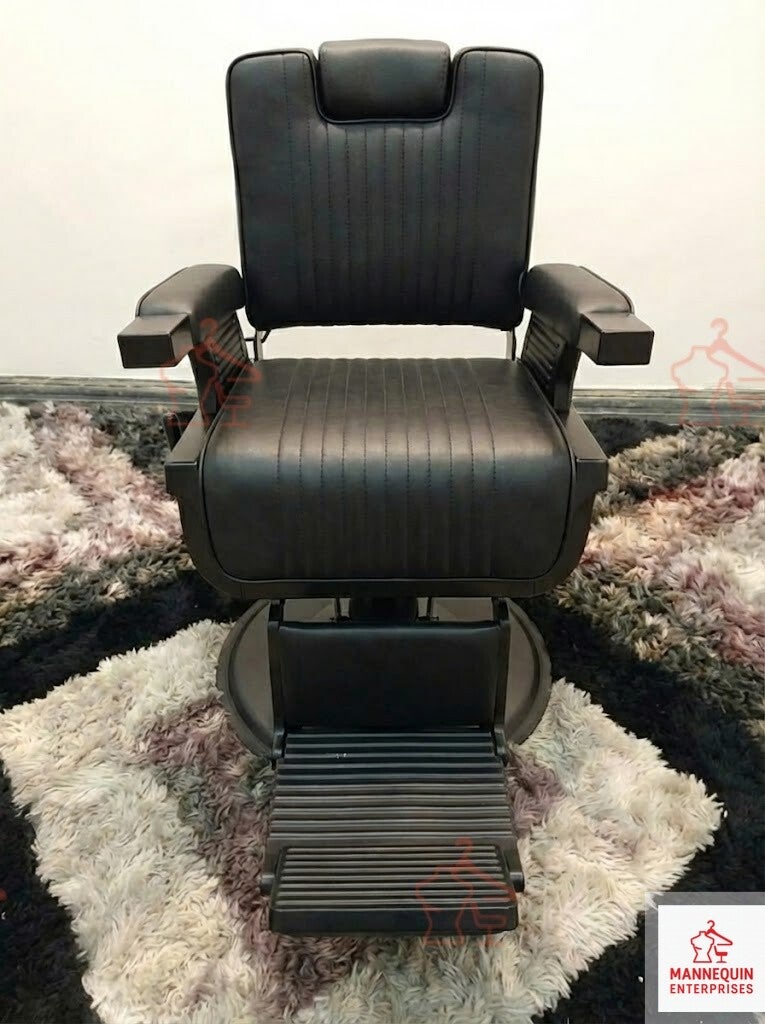 A sleek and modern professional barber chair designed for barbershops and grooming studios that prefer a bold, all-black aesthetic. Upholstered in premium matte black PU leather with detailed vertical stitching, this chair offers superior comfort, durability, and full reclining functionality for professional barber services.
