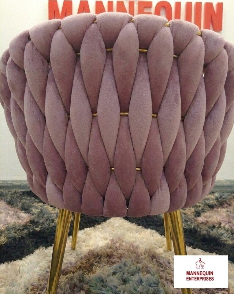 A statement luxury accent chair designed to elevate salons, boutiques, lounges, and stylish interiors. Upholstered in soft blush pink velvet with an eye-catching woven backrest design, this chair is paired with sleek gold-finish metal legs for a refined, modern look. Perfect for reception areas, waiting lounges, makeup rooms, or premium retail spaces.